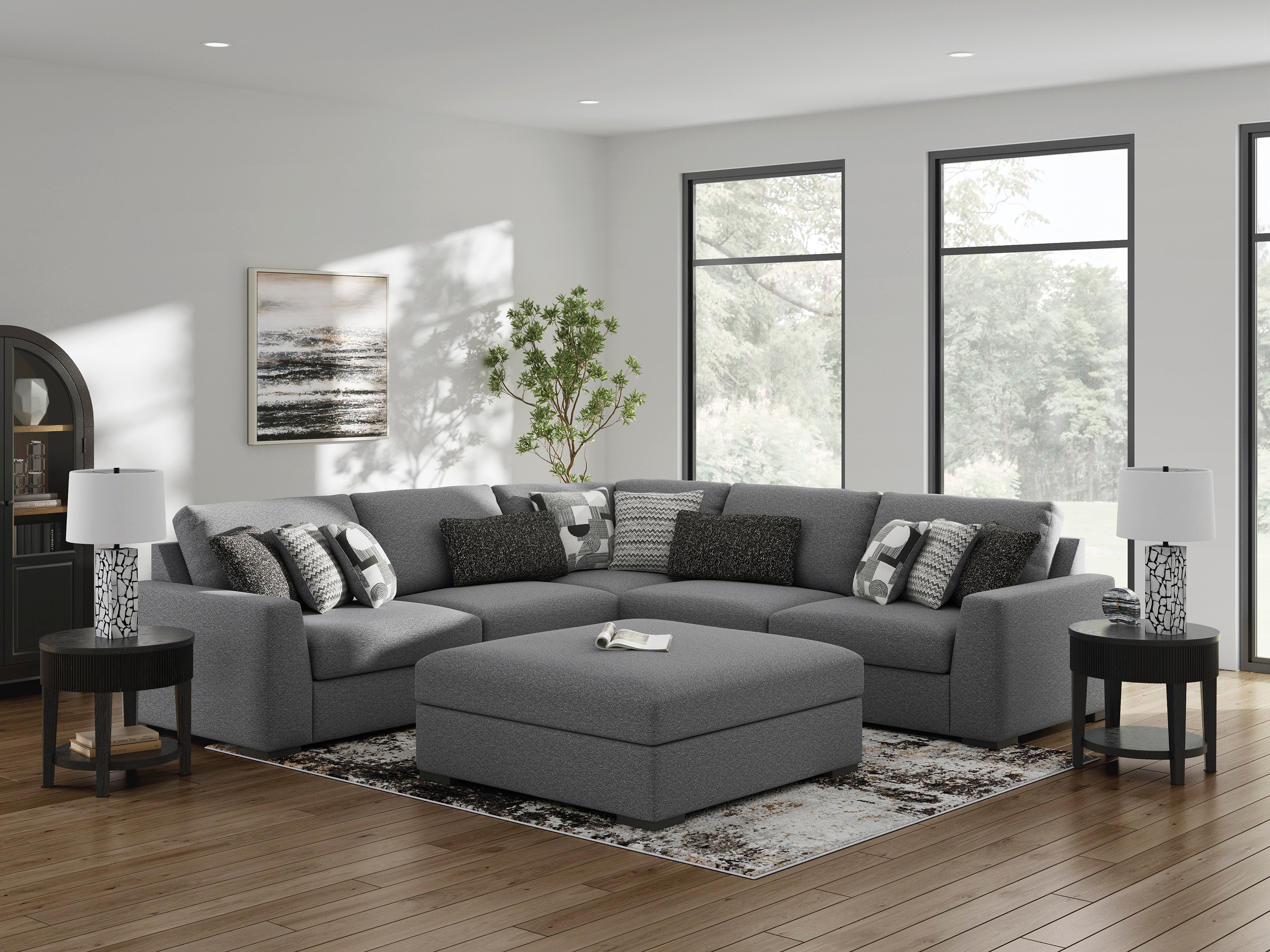 Left-arm facing corner chaise, armless loveseat, and right-arm facing sofa with corner wedge.