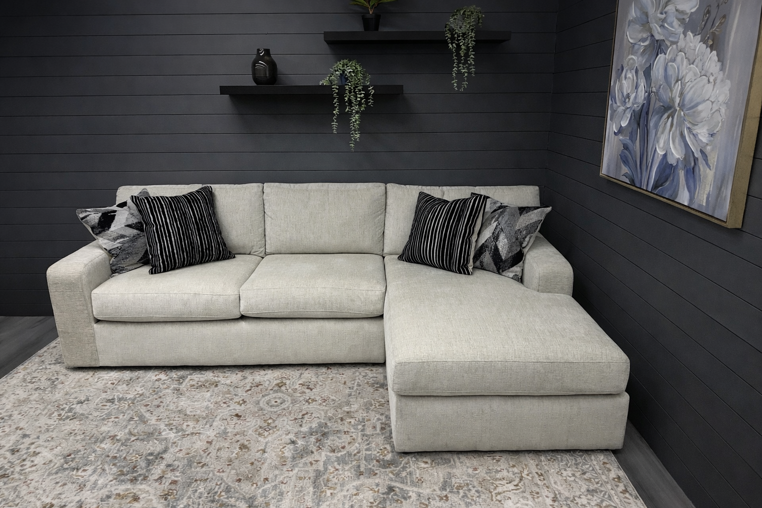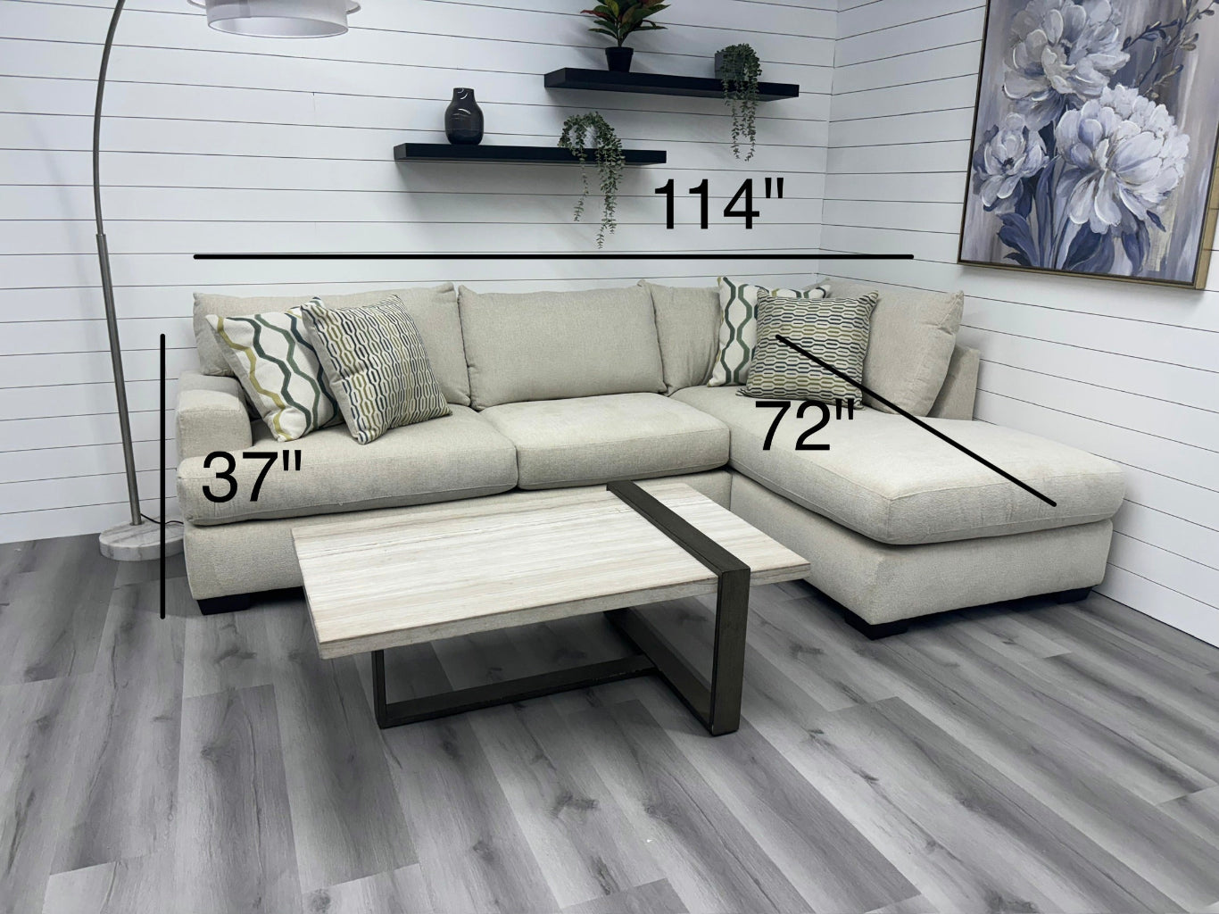 The extended chaise lounge is the star of the design, giving you the perfect spot to stretch out after a long day, curl up with a book, or relax for a movie night. Upholstered in a soft, durable beige fabric, this sectional blends effortlessly with any décor while adding a cozy, inviting feel. Clean lines, supportive cushions, and included accent pillows create a look that’s both comfortable and sophisticated.
