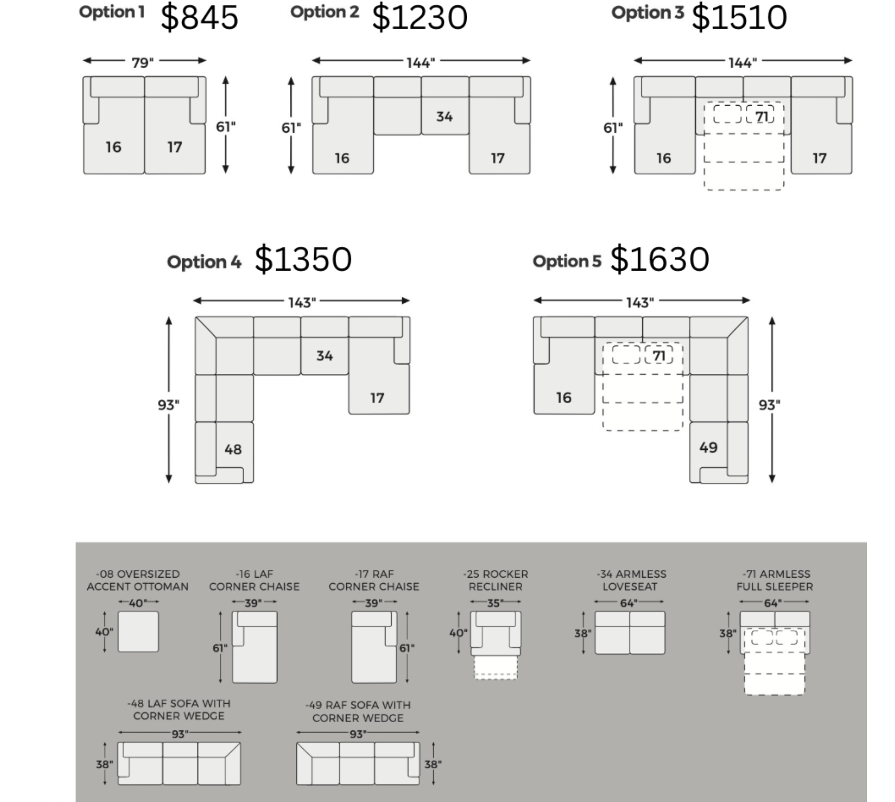 - Grey/beige, a double chaise, or a large U shape Call (480) 910-8363 with an questions about configuration options.